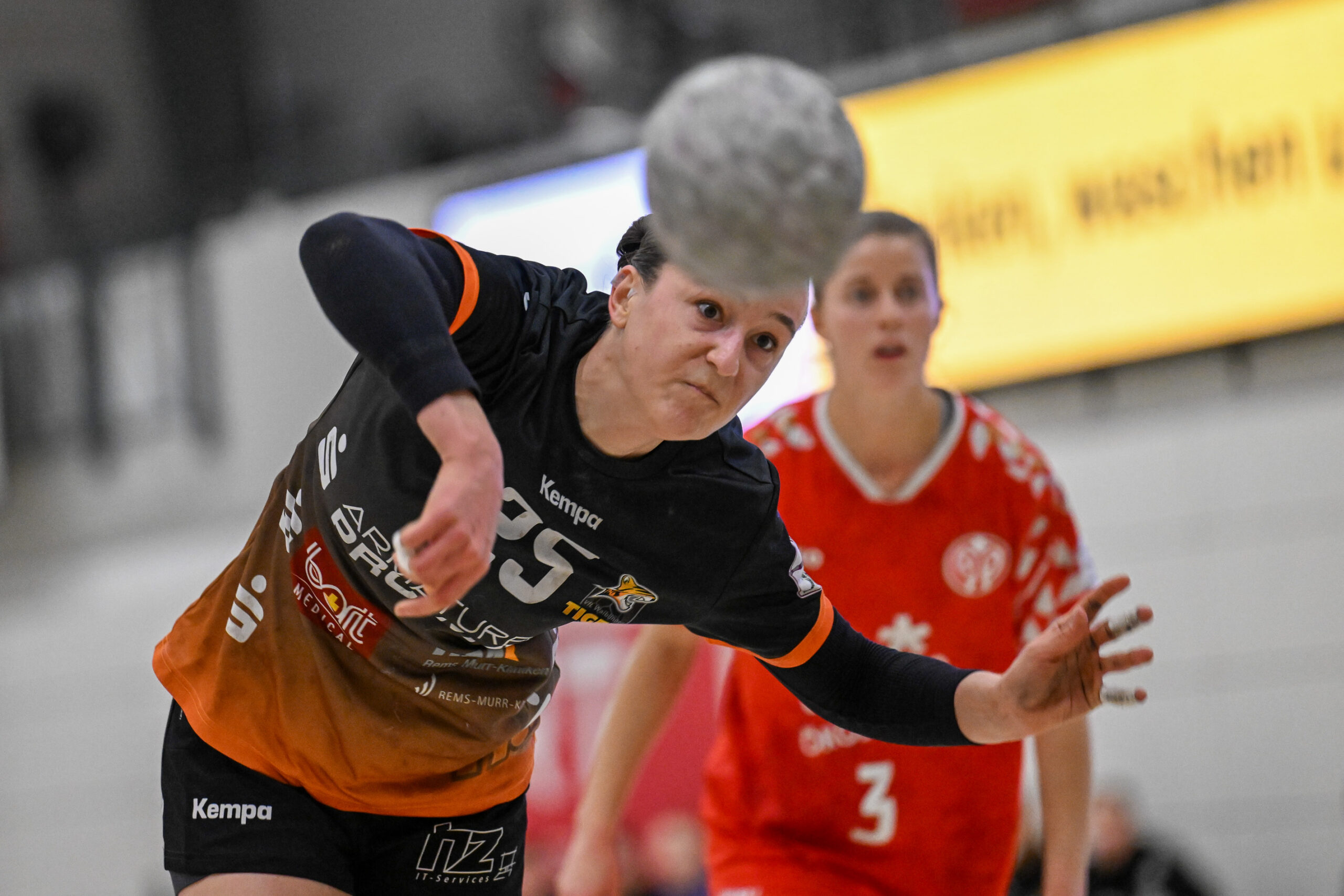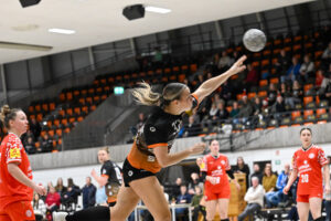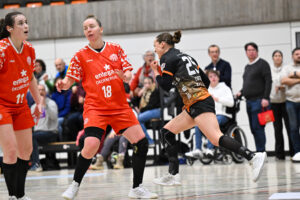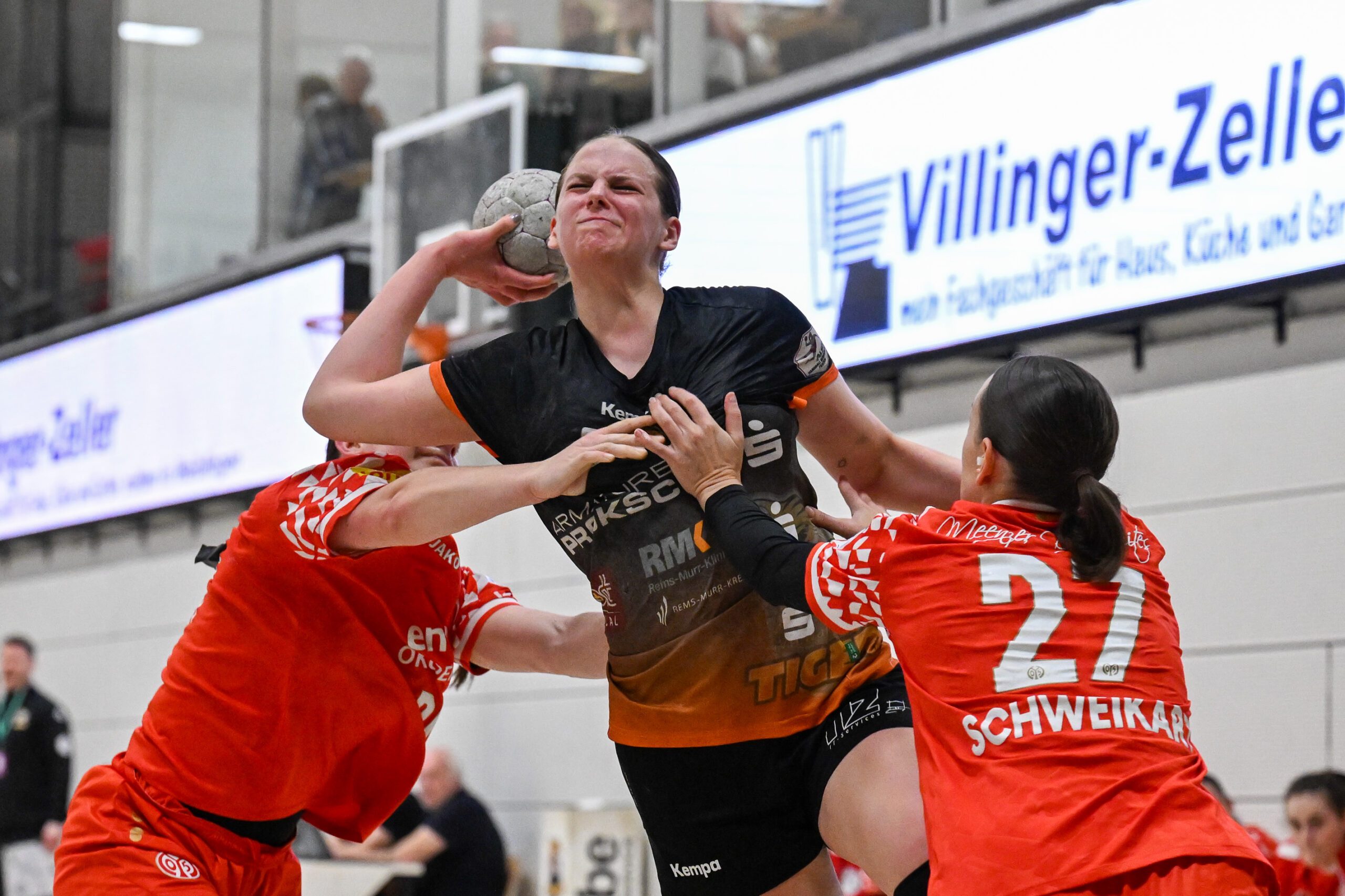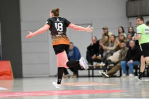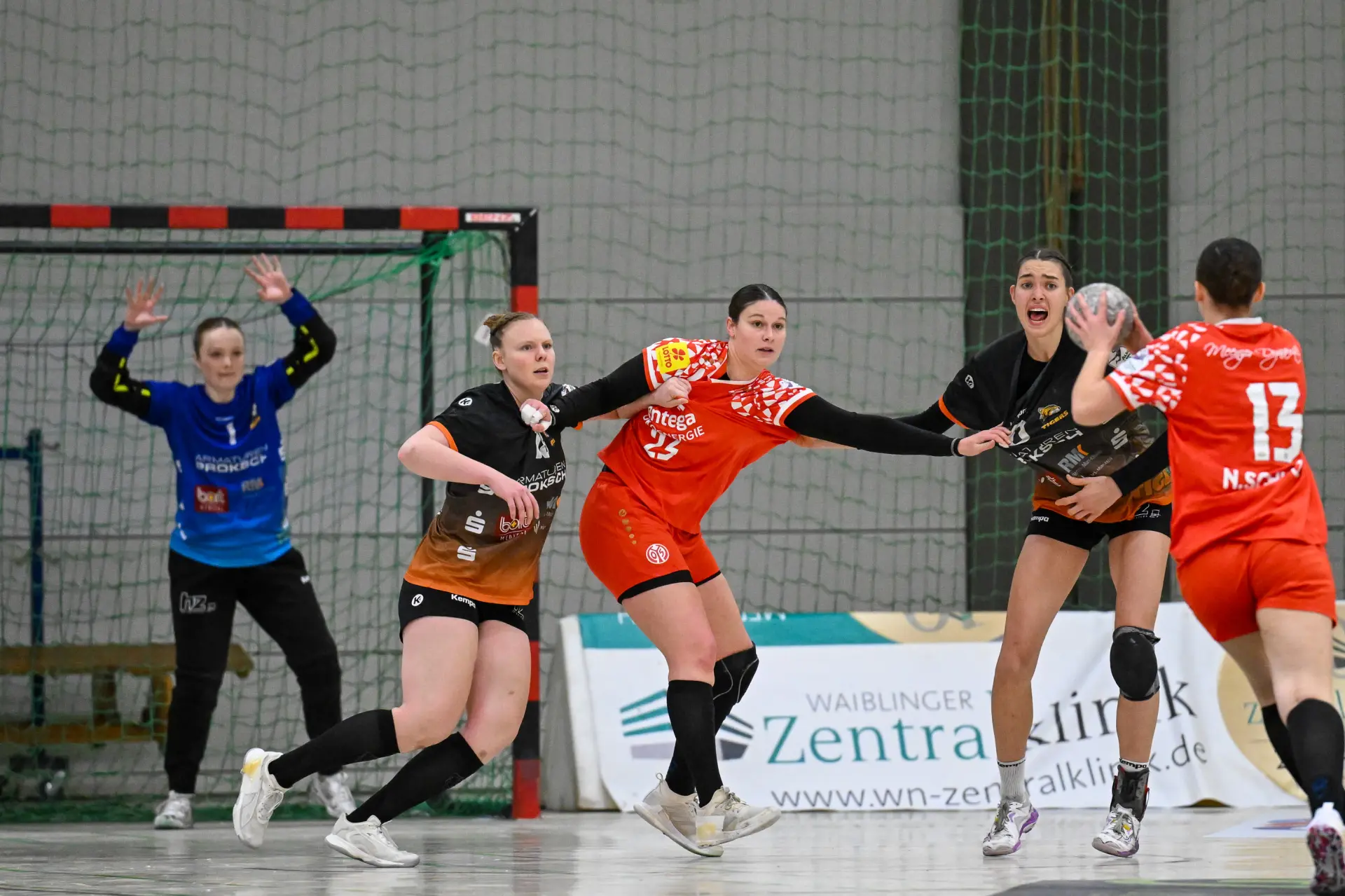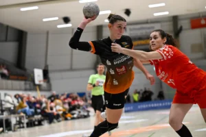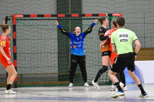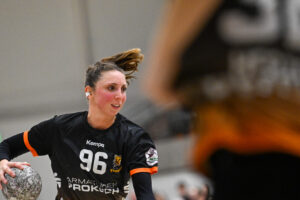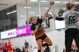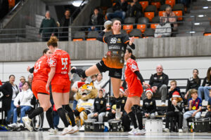 Beide Teams standen von Beginn an in der Abwehr sehr massiv und körperbetont, hinzu kamen beiderseits auch eine Reihe technischer Fehler in der Offensive. Nach achteinhalb Minuten war gerade mal ein einziges Tor gefallen, und so sorgte der TIGERS-Trainer Michael Stettner wohl für ein seltenes oder gar einzigartiges Kuriosum, als er schon beim 0:1-Rückstand die erste Auszeit nahm. Aber die half dem VfL. Die Gäste aus Mainz bissen sich weiterhin an der hochmotivierten und kampfstarken Waiblinger Abwehr die Zähne aus. Lara Eckardt und Cosima Würdinger brachten neuen Schwung in den VfL-Angriff. Und Maxime Luber, bei der ein Tag zuvor ihr Wechsel zum Ligakonkurrenten TG Nürtingen ab der kommenden Saison offiziell bekannt gegeben wurde, zeigte für ihren aktuellen Verein einmal mehr ihre Klasse. Nervenstark vom Siebenmeterpunkt und treffsicher von der Linksaußenposition: Auch Dank den Toren von Maxime zogen die TIGERS bis zur 26. Minute auf 10:6 Tore davon. Erst dann kam der FSV Mainz zurück, bei dem sich nun eine andere frühere Waiblinger Linksaußenspielerin in den Mittelpunkt spielte: Magdalena Probst stand Maxime Luber in nichts nach und traf ebenso sicher per Strafwurf und von Linksaußen. Der VfL hingegen ließ in der Schlussphase im Angriff gleich mehrere „Hundertprozentige“ liegen und führte zur Halbzeit nur noch knapp mit 10:9.