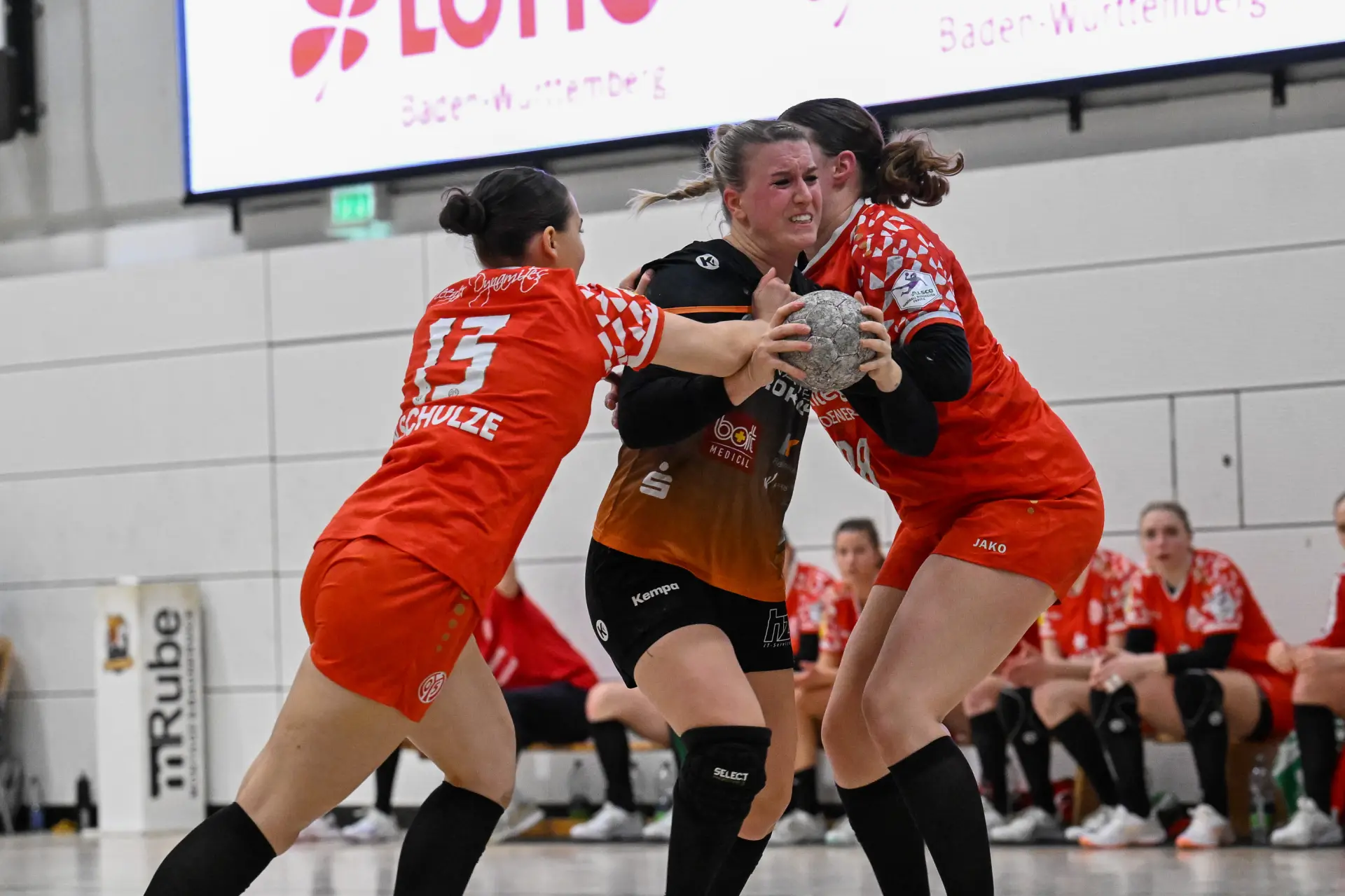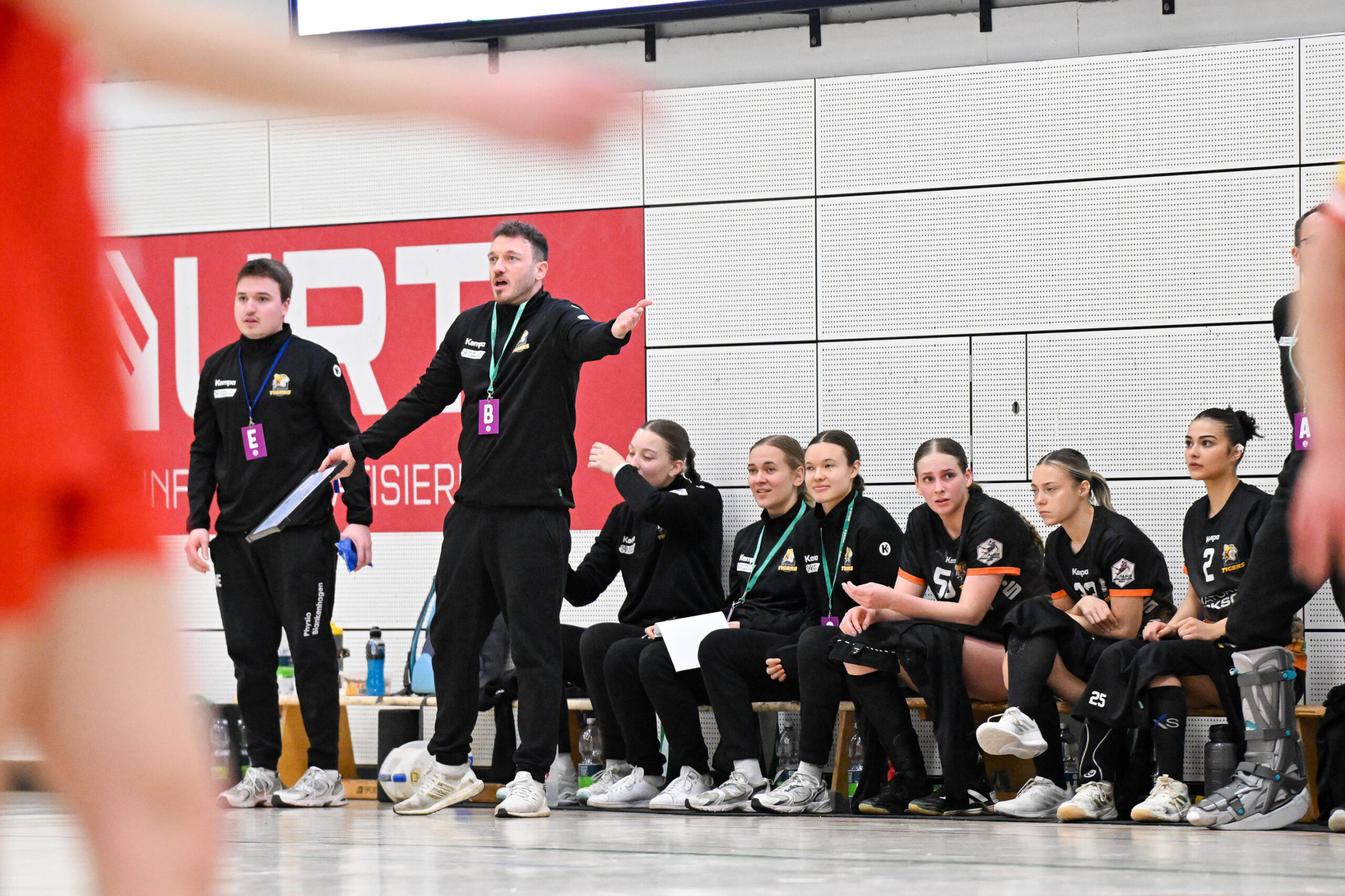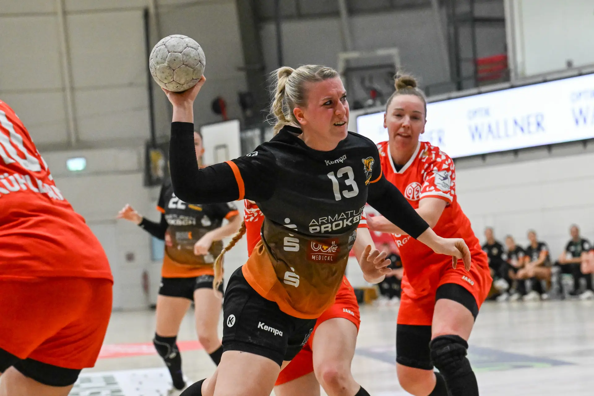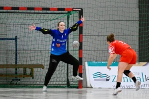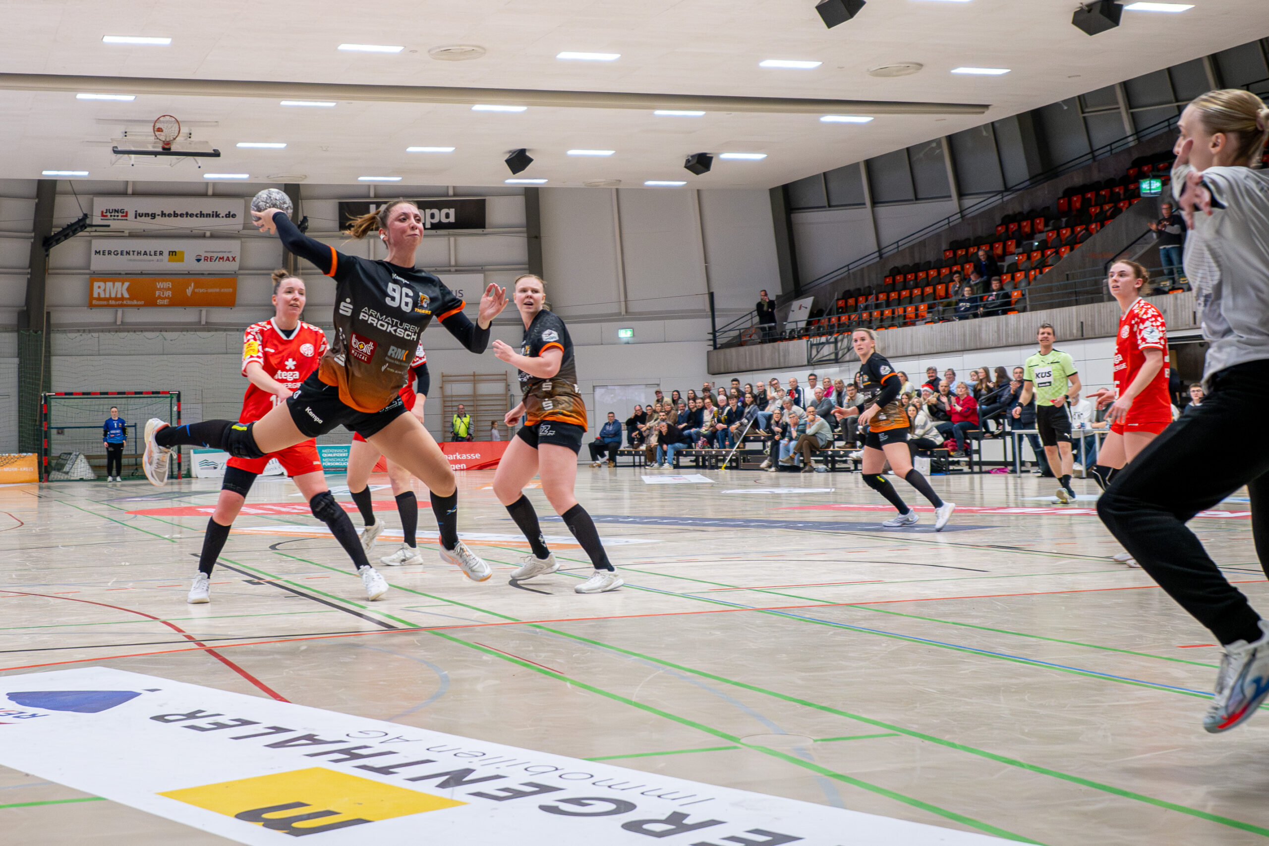 Beide Teams standen von Beginn an in der Abwehr sehr massiv und körperbetont, hinzu kamen beiderseits auch eine Reihe technischer Fehler in der Offensive. Nach achteinhalb Minuten war gerade mal ein einziges Tor gefallen, und so sorgte der TIGERS-Trainer Michael Stettner wohl für ein seltenes oder gar einzigartiges Kuriosum, als er schon beim 0:1-Rückstand die erste Auszeit nahm. Aber die half dem VfL. Die Gäste aus Mainz bissen sich weiterhin an der hochmotivierten und kampfstarken Waiblinger Abwehr die Zähne aus. Lara Eckardt und Cosima Würdinger brachten neuen Schwung in den VfL-Angriff. Und Maxime Luber, bei der ein Tag zuvor ihr Wechsel zum Ligakonkurrenten TG Nürtingen ab der kommenden Saison offiziell bekannt gegeben wurde, zeigte für ihren aktuellen Verein einmal mehr ihre Klasse. Nervenstark vom Siebenmeterpunkt und treffsicher von der Linksaußenposition: Auch Dank den Toren von Maxime zogen die TIGERS bis zur 26. Minute auf 10:6 Tore davon. Erst dann kam der FSV Mainz zurück, bei dem sich nun eine andere frühere Waiblinger Linksaußenspielerin in den Mittelpunkt spielte: Magdalena Probst stand Maxime Luber in nichts nach und traf ebenso sicher per Strafwurf und von Linksaußen. Der VfL hingegen ließ in der Schlussphase im Angriff gleich mehrere „Hundertprozentige“ liegen und führte zur Halbzeit nur noch knapp mit 10:9.